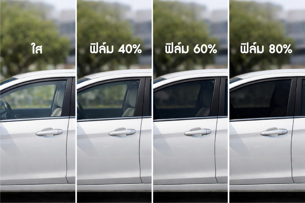 การเลือกความเข้มฟิล์มกรองแสงรถยนต์ ปกติเราจะเรียกเป็น “เปอร์เซ็นต์ (%)” ครับ ซึ่งเป็นความเข้าใจที่คลาดเคลื่อนนิดหน่อยในทางเทคนิค แต่เป็นมาตรฐานที่ร้านฟิล์มในไทยใช้สื่อสารกับลูกค้าเพื่อให้เห็นภาพง่ายที่สุด