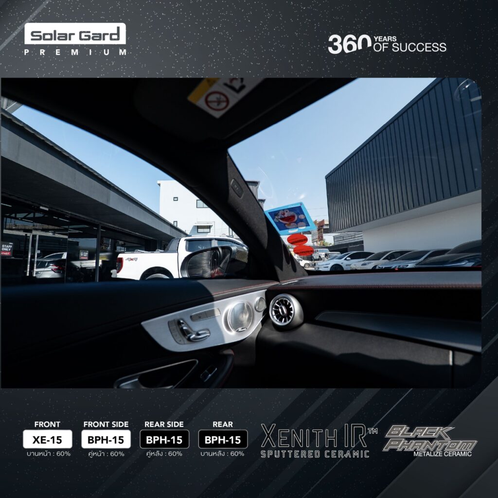 ฟิล์มเซรามิค Solar Gard Black Phantom ดำสุขุมนุ่มลึก กันร้อนได้สูงสุด 96% เย็นเร็วไม่อับ ป้องกันรังสี UV ระดับ SPF 385+ เคลียร์ชัด มองสบาย ไม่รบกวนสัญญาณ 4G/5G/GPS
